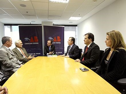Brasília, 06/05/2010 - O presidente nacional da Ordem dos Advogados do Brasil (OAB), Ophir Cavalcante, recebeu hoje (06) a visita do advogado Fernando Fragoso, que foi eleito para conduzir o Instituto dos Advogados Brasileiros (IAB) no biênio 2010-2012. Ele entregou a Ophir o convite para a sua sessão solene de posse, que será realizada às 18h do próximo dia 14, na sede do IAB, no Rio de Janeiro. Também participaram da reunião, na sede da OAB Nacional,os diretores da entidade: Alberto de Paula Machado (vice-presidente), Marcus Vinícius Furtado Coêlho (secretário-geral), Márcia Machado Melaré (secretária-geral adjunta) e Miguel Cançado (diretor-tesoureiro).
