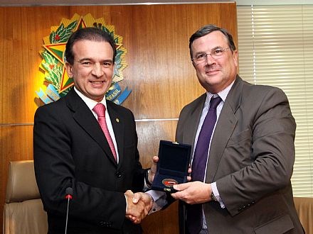 Brasília, 02/02/2011 - O presidente nacional da Ordem dos Advogados do Brasil (OAB), Ophir Cavalcante, conferiu, na noite dessa terça-feira, ao presidente do Barreau de Paris, Jean Castelain, a medalha comemorativa dos 80 anos de criação da OAB. A homenagem se deu na sede da Seccional da OAB do Distrito Federal, em Brasília, durante a visita da delegação do Barreau de Paris - entidade congênere da OAB na capital francesa -, que está no Brasil para conhecer o funcionamento do Poder Judiciário e sua relação com a advocacia nacional.