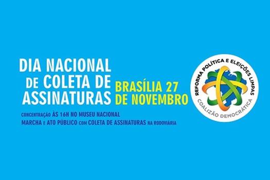 O “Dia Nacional de Coleta de Assinaturas” marca o inicio de uma mobilização para recolher as cerca de 1,5 milhão de assinaturas necessárias para que sejam tramite no projeto de lei que altera as regras eleitorais como: a proibição do financiamento privado de campanhas eleitorais; a punição com cadeia para o crime de caixa 2; o fortalecimento dos partidos políticos com a mudança do sistema político eleitoral; a ampliação da participação feminina, entre outros.