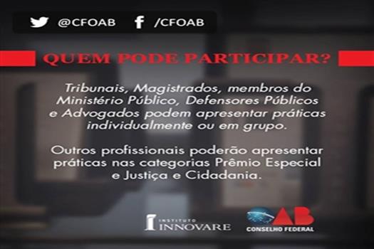 Além da categoria Advocacia, existem as: Tribunal; Juiz; Ministério Público (MP); Defensoria Pública; Prêmio Especial e Justiça e cidadania. Podem participar magistrados, membros do MP estadual e federal, defensores públicos e profissionais de qualquer área do conhecimento, que estejam aumentando a qualidade da prestação jurisdicional e contribuindo com a modernização da Justiça Brasileira.