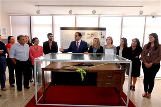A mesa de dona Lyda, com as marcas deixadas pela bomba que levou sua vida, está exposta no Memorial da OAB, em Brasília.