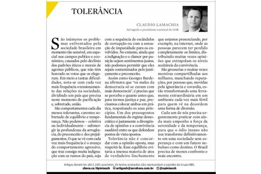 Artigo do presidente Claudio Lamachia: Tolerância