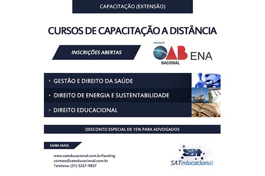 Brasília – Estão abertas as inscrições para novas turmas de três cursos de extensão oferecidos em parceria entre a Escola Nacional de Advocacia e o SAT Educacional. Com previsão de início em 31 de março, os cursos são: Gestão e Direito da Saúde, Direito de Energia e Sustentabilidade, e Direito Educacional.
