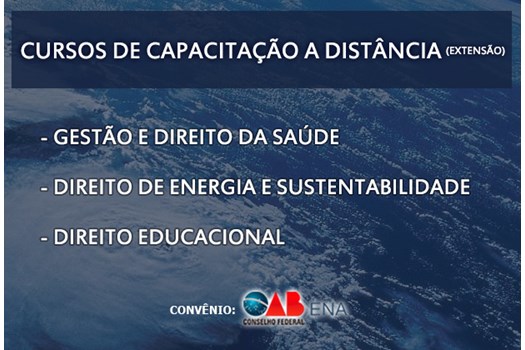 Brasília – Estão abertas as inscrições para novas turmas de três cursos de extensão oferecidos em parceria entre a Escola Nacional de Advocacia e o SAT Educacional. Com previsão de início em 30 de junho, os cursos são: Gestão e Direito da Saúde, Direito de Energia e Sustentabilidade, e Direito Educacional.