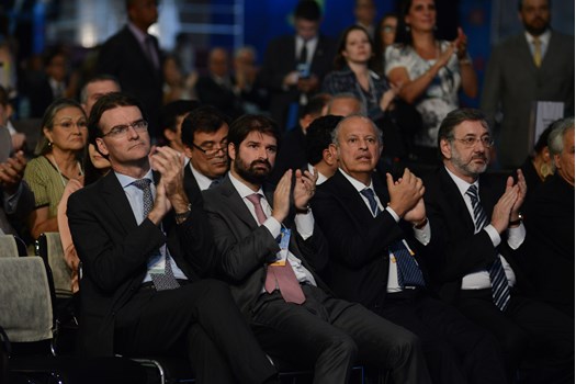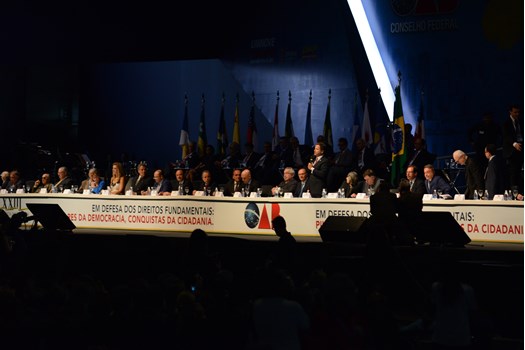 A mesa de honra da XXIII Conferência Nacional da Advocacia Brasileira teve a presença das seguintes autoridades: Claudio Lamachia, presidente nacional da OAB; Cármen Lúcia, presidente do Supremo Tribunal Federal; Geraldo Alckmin, governador do Estado de São Paulo; Marcos da Costa, presidente da OAB de São Paulo; Emmanoel Pereira, vice-presidente do Tribunal Superior do Trabalho; senador Álvaro Dias; Alexandre de Moraes, ministro do STF; Luis Felipe Salomão, ministro do STJ; desembargador Paulo Dimas de Bellis Mascaretti, presidente do Tribunal de Justiça de São Paulo.