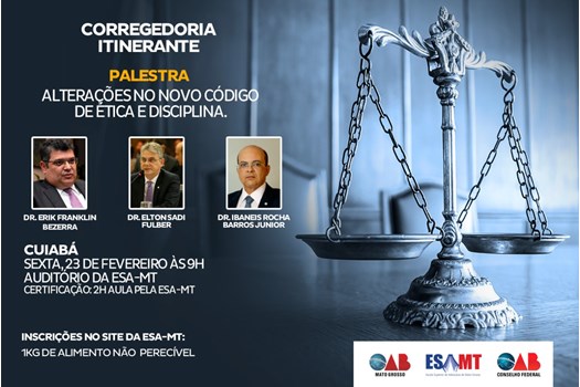 Brasília - A seccional mato-grossense da OAB receberá no dia 23 de fevereiro de 2018 – uma sexta-feira – o projeto “Corregedoria Itinerante”, uma ação da Corregedoria-Geral do Conselho Federal da Ordem que visa esclarecer a advocacia sobre as atualizações do novo Código de Ética e Disciplina (CED). O corregedor nacional da OAB, Ibaneis Rocha, participará das atividades.