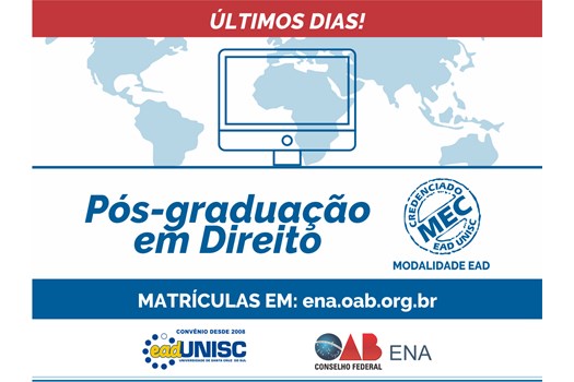 Em parceria com a Unisc, a ENA oferece pós-graduação nas áreas de Advocacia Avançada, Advocacia Criminal, Advocacia Imobiliária, Urbanística, Registral e Notarial, Advocacia Penal Empresarial, Advocacia Trabalhista e Previdenciária, Direito e Processo do Trabalho, Direito Eleitoral e Direito Processual Civil.
