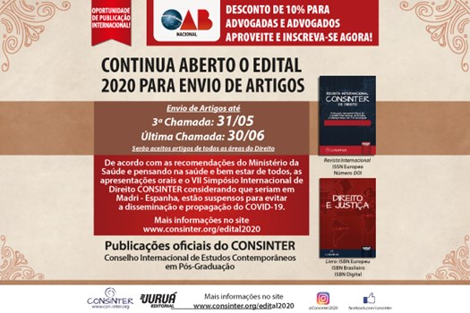 A advocacia terá 10% de desconto na taxa de inscrição. Serão aceitos os trabalhos com os seguintes temas: direitos difusos, coletivos e individuais homogêneos; direito público; direito privado; e direito internacional. Os artigos devidamente inscritos até a data da última chamada e aprovados vão compor as publicações oficiais do Consinter, com direito a emissão de declaração de comprovação de produção científica, mediante solicitação dos autores.
