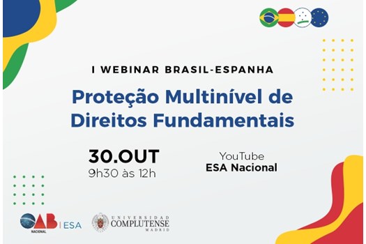 A OAB Nacional, em parceria com a ESA Nacional e a Universidad Complutense de Madrid, realiza no dia 30 de outubro o I Webinar Brasil-Espanha: Proteção multinível de direitos fundamentais. O evento é parte do acordo de cooperação firmado entre OAB, ESA e a universidade para a realização de cursos, congressos e seminários que permitam aprofundar o conhecimento do Direito e das instituições jurídicas que apresentem particular relevância no exercício da advocacia. O webinar terá como temas centrais o processo, o controle de constitucionalidade e a proteção dos direitos fundamentais.