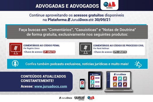 Neste mês de setembro, a Editora Juruá segue oferecendo acesso gratuito à Plataforma JuruáDocs para as obras “Comentários ao Código de Processo Civil” e “Comentários ao Código Penal”. Basta acessar a plataforma e usar as respectivas chaves para acessar os produtos: “CPC-GRATIS” e “CP-GRATIS”; o acesso estará liberado até o dia 30/09/2021.