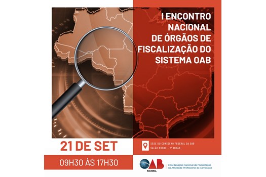 No dia 21 de setembro, das 9h30 às 17h30, o Conselho Federal da Ordem dos Advogados do Brasil (CFOAB) sediará o I Encontro Nacional de Órgãos de Fiscalização do Sistema OAB. Na ocasião, estarão reunidos dirigentes das estruturas administrativas da OAB responsáveis pelas atividades fiscalizatórias, tanto no CFOAB quanto nas seccionais.