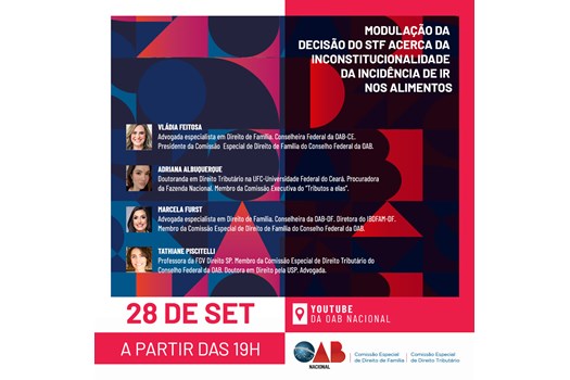 Na noite desta quinta-feira (28/9), às 19h, a OAB Nacional, em seu canal do YouTube, apresentará o debate "Modulação da decisão do STF acerca da inconstitucionalidade da incidência de IR nos alimentos". O debate é uma realização das comissões Especial de Direito de Família (CEDF) e Especial de Direito Tributário (CEDT).