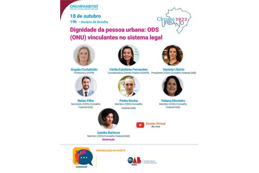 A Comissão Especial de Direito Urbanístico (CEDU) do Conselho Federal da OAB apresentará, na próxima terça-feira (18/10), às 19h, seu projeto de evento aprovado para o Circuito Urbano da Organização das Nações Unidas (ONU), ocasião em que são promovidos debates sobre temas ligados ao direito no desenvolvimento das cidades. O evento terá transmissão ao vivo pelo canal da OAB no Youtube.