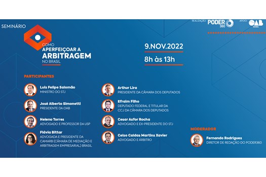 O seminário também abordará os desafios para implantar melhorias na arbitragem e a contribuição de iniciativas para o atual arcabouço jurídico brasileiro. O seminário, que será mediado pelo diretor de Redação do Poder360, Fernando Rodrigues, e pela presidente do Ieja (Instituto de Estudos Jurídicos Aplicados), Fabiane Oliveira, terá ainda as participações de Efraim Filho (União-PB), deputado federal e titular da CCJ (Comissão de Constituição e Justiça) da Câmara dos Deputados; Cesar Asfor Rocha, advogado e ex-presidente do STJ; Heleno Torres, advogado e professor da USP (Universidade de São Paulo); Celso Caldas Martins Xavier, advogado e árbitro; e Flávia Bittar, advogada e presidente da Camarb (Câmara de Mediação e Arbitragem Empresarial) Brasil.