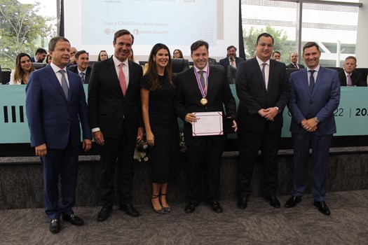 O vice-presidente da OAB Nacional, Rafael Horn, participou nesta sexta-feira (14/4) da entrega da Medalha Maurício Montanha Teixeira ao presidente da Caixa de Assistência dos Advogados do RS (CAARS), Pedro Zanette Alfonsin. A entrega foi realizada no auditório do OAB-RS Cubo, em Porto Alegre, durante o 3º Encontro de Delegados da gestão 2022-2024. A condecoração é a maior honraria outorgada pela Coordenação Nacional das Caixas de Assistência dos Advogados do Brasil (Concad).