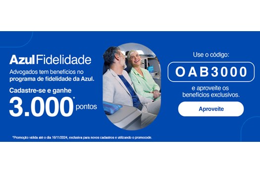 Até o dia 16 de novembro, quem se cadastrar no programa de fidelidade da Azul inserindo o código OAB3000 no campo "possuo um código promocional de cadastro", irá receber uma bonificação de três mil pontos na sua nova conta. Os pontos bônus serão creditados em até 15 dias após o término da campanha e terão validade de seis meses, contados a partir da data do crédito. Depois, é só baixar o aplicativo da Azul e aproveitar o benefício.