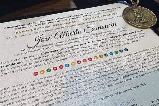 Em reconhecimento ao seu papel central na construção de práticas ESG (iniciativas de cunho ambiental, social e de governança) no Brasil, e pelo seu histórico em defesa da justiça social, dos direitos humanos e da governança ética, o presidente nacional da OAB, Beto Simonetti, e a própria entidade foram agraciados com a Medalha “Busumuru” Kofi Atta Annan – O Homem do Planeta. A homenagem, promovida pelo Instituto Global ESG em parceria com a Kofi Annan Foundation, leva o nome do líder ganês e celebra os que seguem os ideais de Annan na promoção de um futuro mais justo e sustentável.