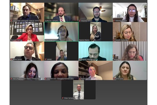 Nesta sexta-feira (18/7), a Comissão deu sequência aos trabalhos e realizou reunião com a presidente do Conselho de Recursos da Previdência Social, Ana Cristina Viana Silveira. Em pauta, a automatização de procedimentos administrativos, a jurisprudência do órgão, a disponibilização de intimação da pauta com link da sustentação oral, e a reavaliação e aprimoramento do cumprimento de decisões, entre outros.