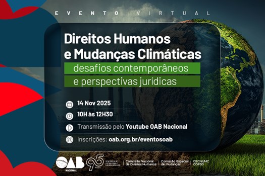 Em meio à semana da COP30, o Conselho Federal da OAB promove, nesta sexta-feira (14/11), das 10h às 12h30, o evento virtual “Direitos Humanos e Mudanças Climáticas: desafios contemporâneos e perspectivas jurídicas”. A proposta é aproximar a advocacia dos debates centrais sobre a crise climática e seus impactos diretos sobre os direitos humanos, destacando caminhos jurídicos para enfrentar o cenário. O evento será transmitido no canal da OAB Nacional no Youtube.