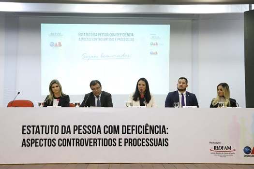 Compuseram a mesa de honra o vice-presidente da Comissão dos Direitos da Pessoa com Deficiência do Conselho Federal da OAB, Joelson Costa Dias; a presidente do Instituto Brasileiro do Direito de Família no Distrito Federal (IBDFAM-DF), Renata Nepomuceno e Cysne; o diretor sociocultural do IBDFAM-DF, Leonardo Vieira Carvalho; a presidente da Comissão de Estudos Constitucionais da Família do IBDFAM-DF, Ana Carolina Pires de Souza Sena; e a vice-presidente da Comissão, Mikaela Minaré Braúna.