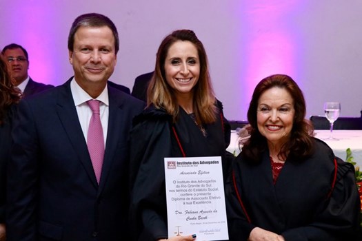 A presidente do IARGS, Sulamita Santos Cabral, aferiu: “Estamos comemorando, hoje, o nonagésimo segundo aniversário de criação do nosso IARGS e o fazemos de uma forma muito gratificante, pois recebemos novos e qualificados associados e prestamos uma justa homenagem ao presidente nacional da OAB, Claudio Pacheco Prates Lamachia”, disse Sulamita. “Primeiro gaúcho a presidir a OAB nacional, Claudio Lamachia, a diretoria do nosso Instituto, referendada pelo Conselho, decidiu, tendo em vista a sua atuação à frente da OAB e permanente apoio as nossas atividades, prestarmos uma homenagem que simboliza a nossa admiração pela sua postura ética, sempre na defesa dos princípios morais, da defesa da democracia e dos direitos humanos”, afirmou Sulamita.