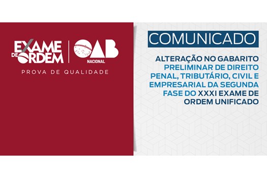 A OAB Nacional, por meio da Coordenação Nacional do Exame de Ordem Unificado, e a Fundação Getulio Vargas, comunicam, nesta sexta-feira (11), a alteração nos gabaritos preliminares da prova prático-profissional (2ª) do XXXI Exame de Ordem Unificado nas áreas de Direito Civil, Direito Empresarial, Direito Penal e Direito Tributário.