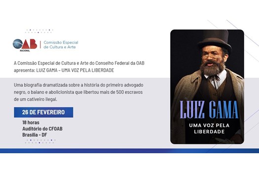 O auditório da OAB Nacional abrirá suas portas para contar a história de Luiz Gama, líder abolicionista responsável por alforriar, pela via judicial, mais de 500 pessoas da condição de escravidão. A peça teatral “Luiz Gama - uma voz pela liberdade”, promovida pela Comissão Especial de Cultura do CFOAB, ocorrerá em 26 de fevereiro, às 18h.